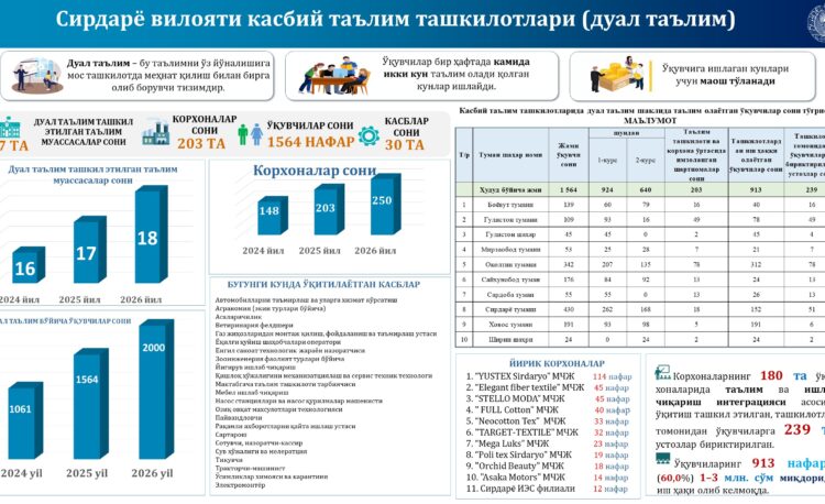 Viloyatdagi kasbiy ta’lim muassasalarida dual ta’lim joriy etilishi, o‘quvchilarni amaliy ko‘nikmalarga ega mutaxassis sifatida tayyorlash jarayoni hamda hamkor korxonalar bilan …