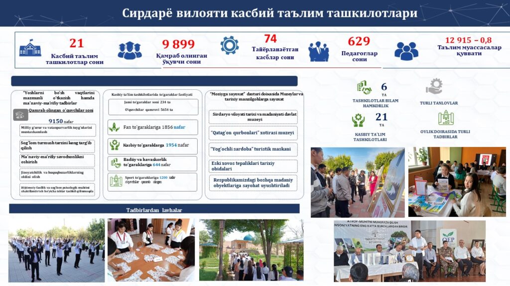 Kasbiy talim tashkilotlarida Yoshlar bilan ishlash samaradorligini oshirish hamda ularni bo’sh vaqtini mazmunli o’tkazishni tashkil etish INFOGRAFIKA