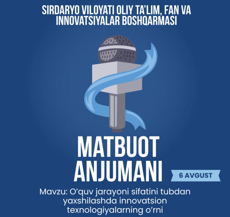 Vaqti: 2025-yil 11-avgustdagi soniO’tkazilish joyi: Yangi Sirdaryo Ijtimoiy-siyosiy, ommaviy gazetasi Sirdaryo viloyat oliy ta’lim, fan va innovatsiyalar boshqarmasi